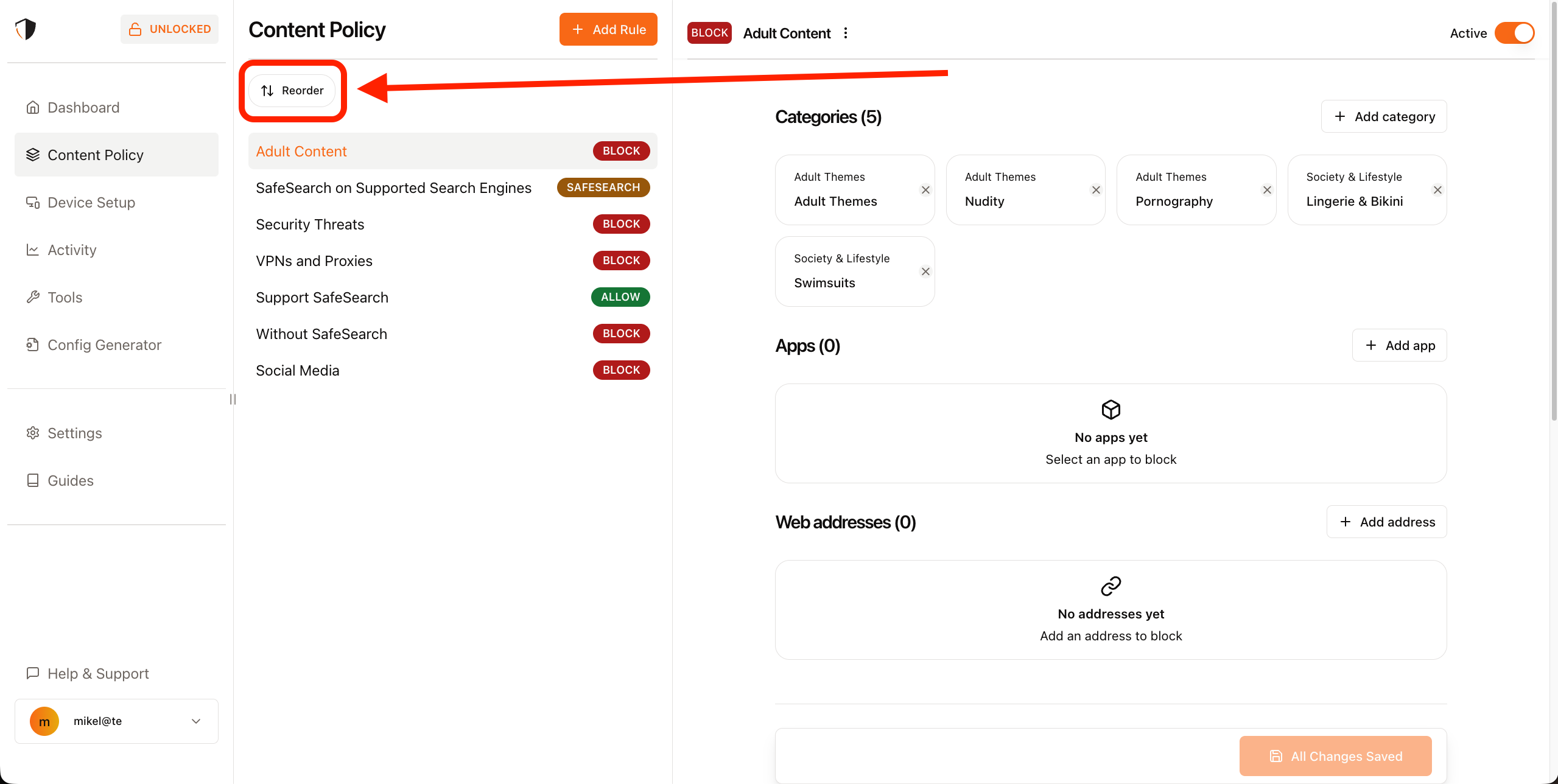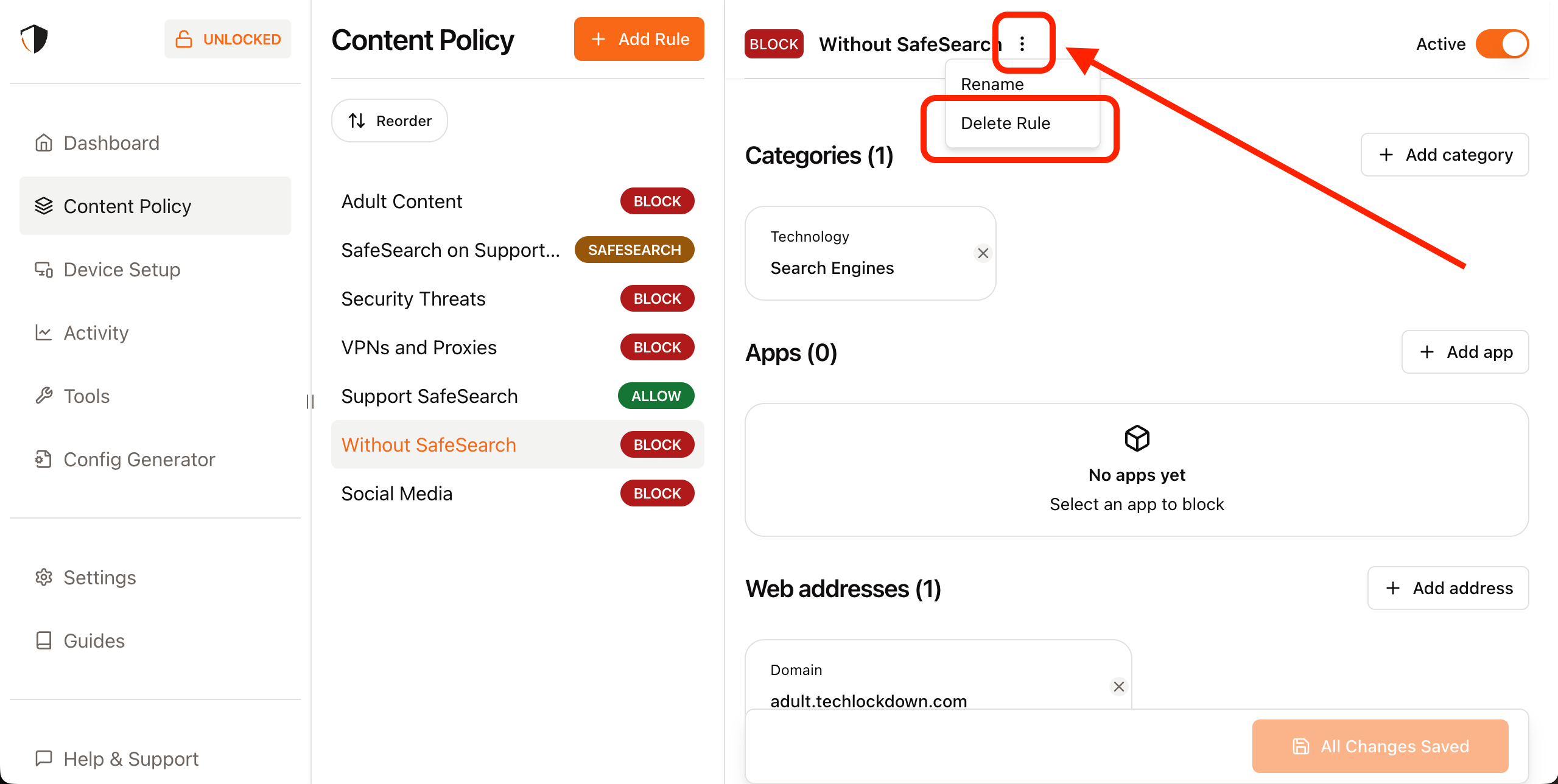A Content Policy allows you to specify rules for what should be blocked, when it should be blocked, and who it should be blocked for. Navigate to the Content Policy section of the Tech Lockdown dashboard to get started.