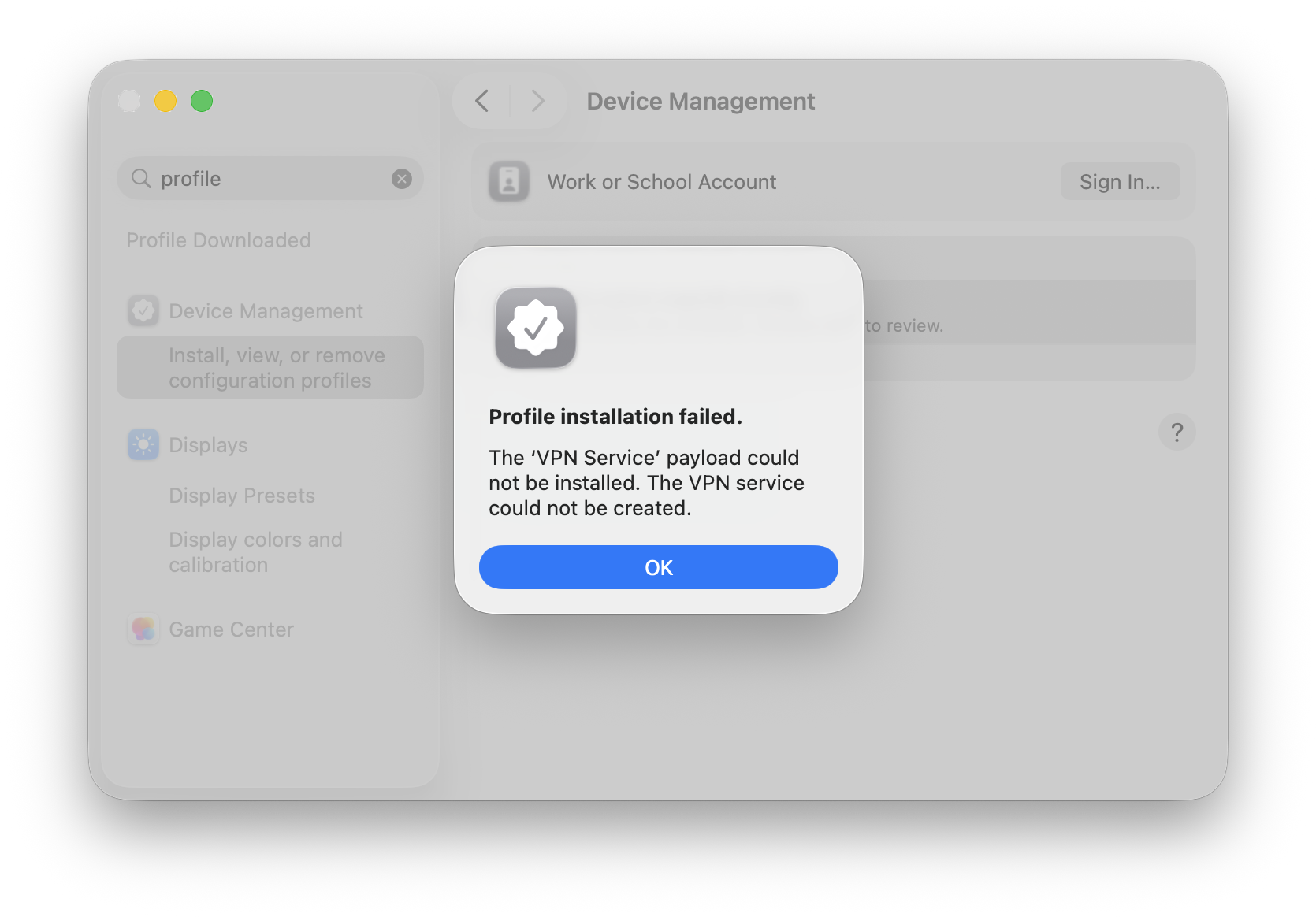 If you are on MacOS 26.0+ and attempting to install a config, but you get the error "Profile installation failed: the 'VPN Service' payload could not be installed. The VPN service could not be created," here is how to proceed.
